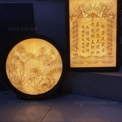 Thành phẩm sau khi được phơi sấy khô thì Bộ tranh trúc chỉ bàn thờ Ông Địa TC6689 được đóng khung và lắp thêm hệ thống đèn led bên trong, tỏa ra ánh sáng vàng đều màu, hiện rõ các họa tiết trên tranh, làm nên những kiệt tác tranh trúc chỉ độc đáo.